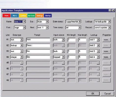 Create your own program in minutes by using the “Application Generator”. The unique application generator feature allows the user to create custom data collection templates quickly and easily on a PC, without writing any program code. The user is presented with a terminal Window screen on the PC to simulate the program’s running sequences on the actual terminal. A new application can be designed on-screen in only a few minutes, downloaded to the terminal, and data collection can begin immediately.